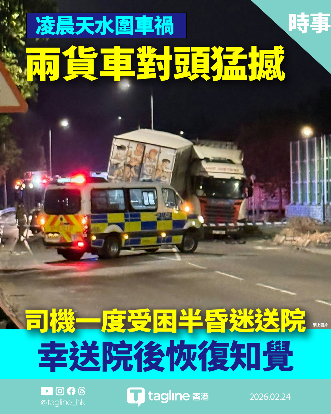 天水圍屏廈路兩貨車對頭猛撼 司機一度受困半昏迷送院