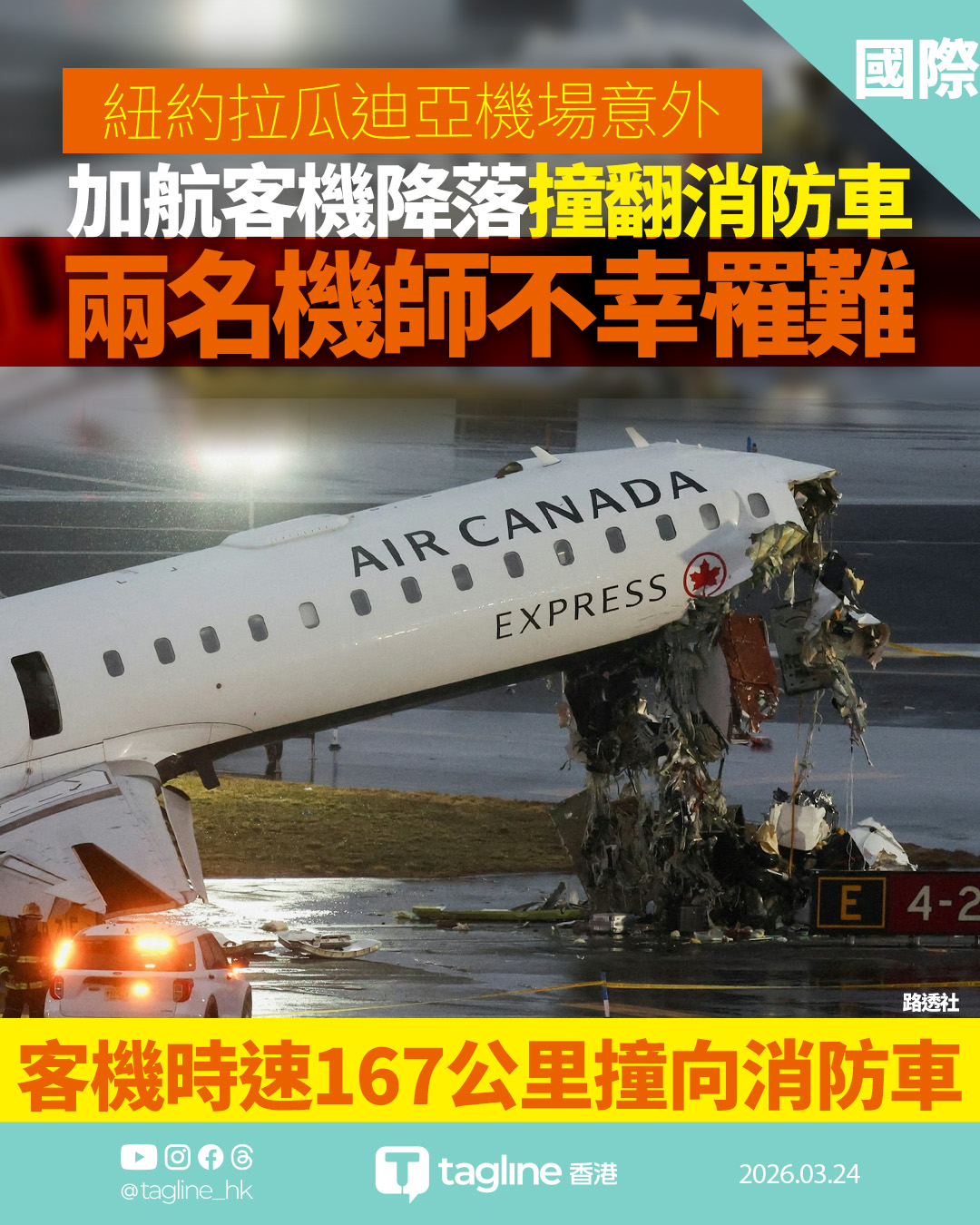 加航客機拉瓜迪亞機場撞消防車 兩機師罹難 機場一度關閉