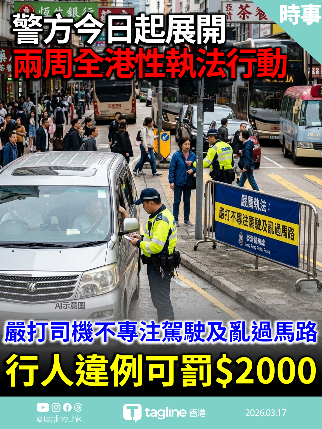 警方今日起展開兩周全港性執法行動 嚴打司機不專注駕駛及亂過馬路 行人違例可罰二千