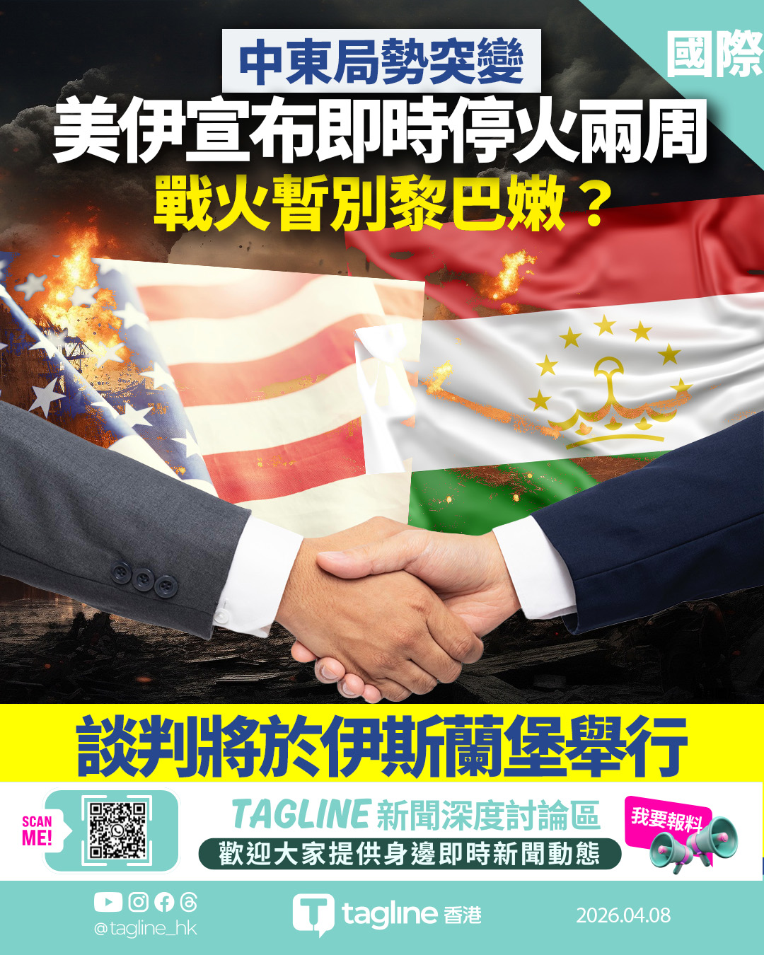 美伊達成兩周停火協議 談判將於伊斯蘭堡舉行 涵蓋黎巴嫩戰線