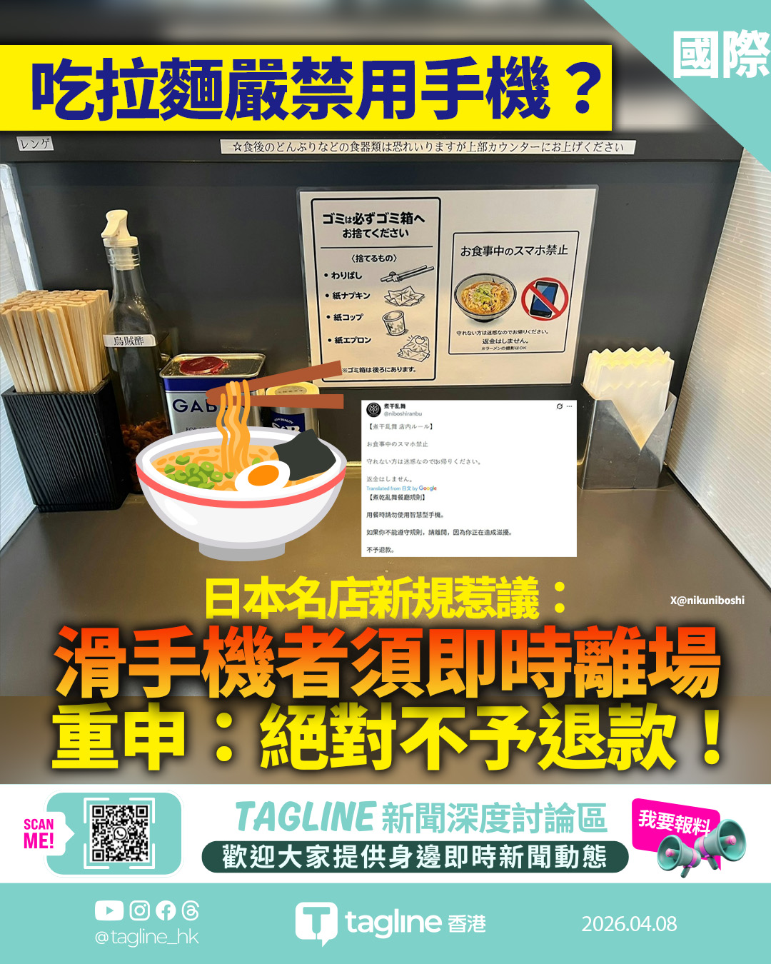 日本拉麵名店新規「禁手機令」:違規即趕客不退款 網民反應兩極
