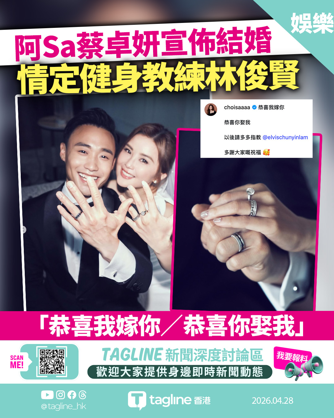 阿Sa蔡卓妍宣佈結婚!情定健身教練林俊賢 社交平台發文:恭喜我嫁你