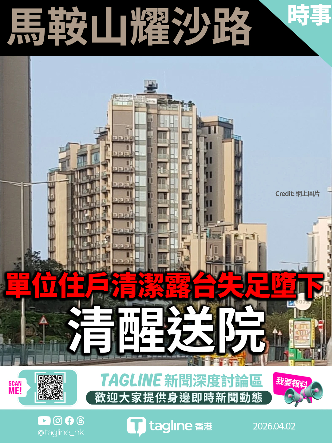 馬鞍山耀沙路單位住戶清潔露台失足墮下 清醒送院