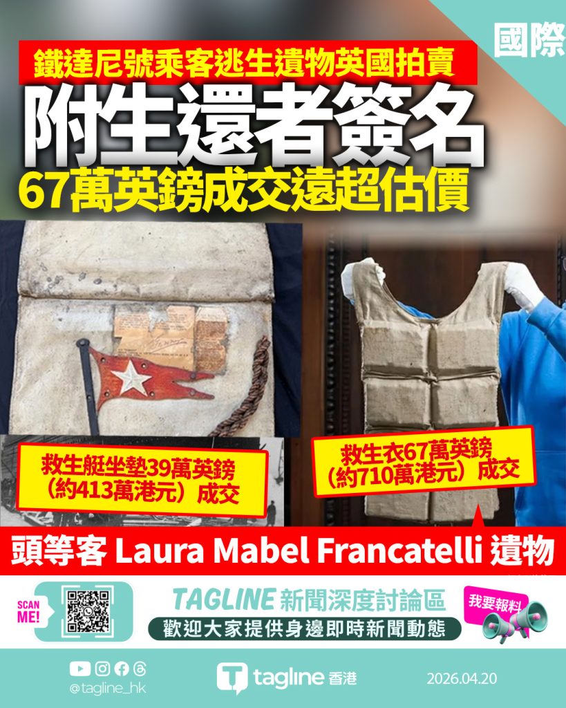 【世紀船難遺物】鐵達尼號生還者簽名救生衣拍賣 710萬港元成交超估價一倍