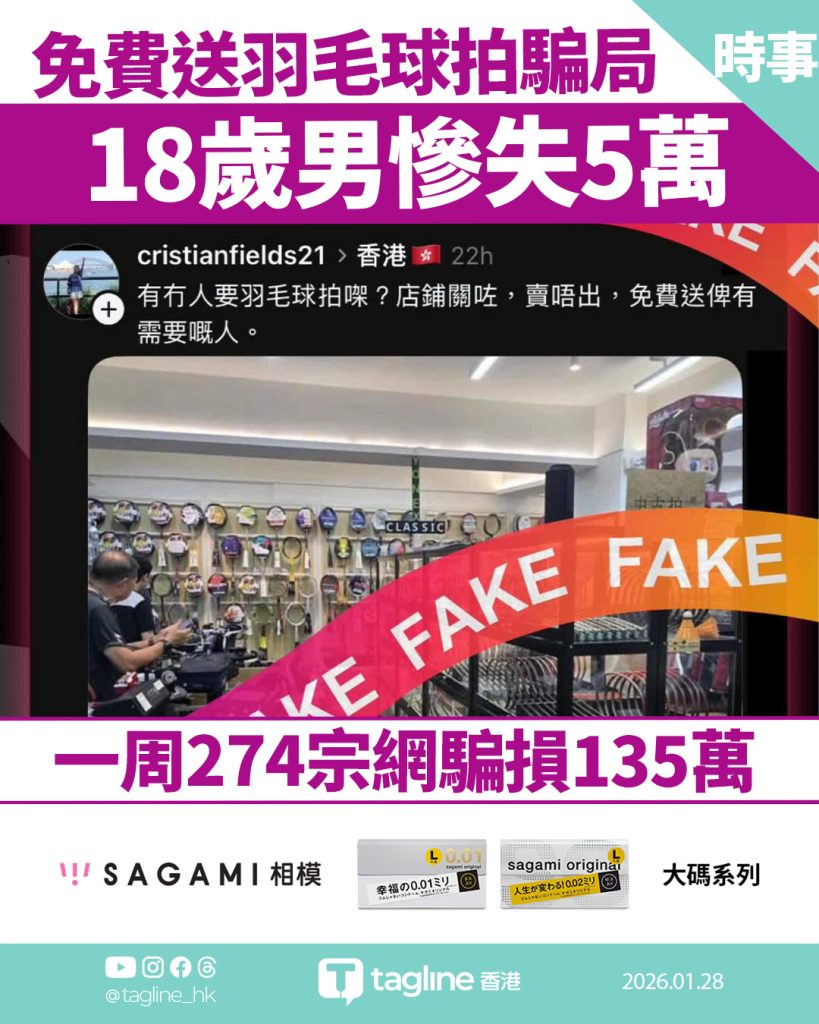【Sagami安全套特約】「免費送羽毛球拍」騙局橫行 18歲仔慘失5萬 一周274宗網騙損135萬