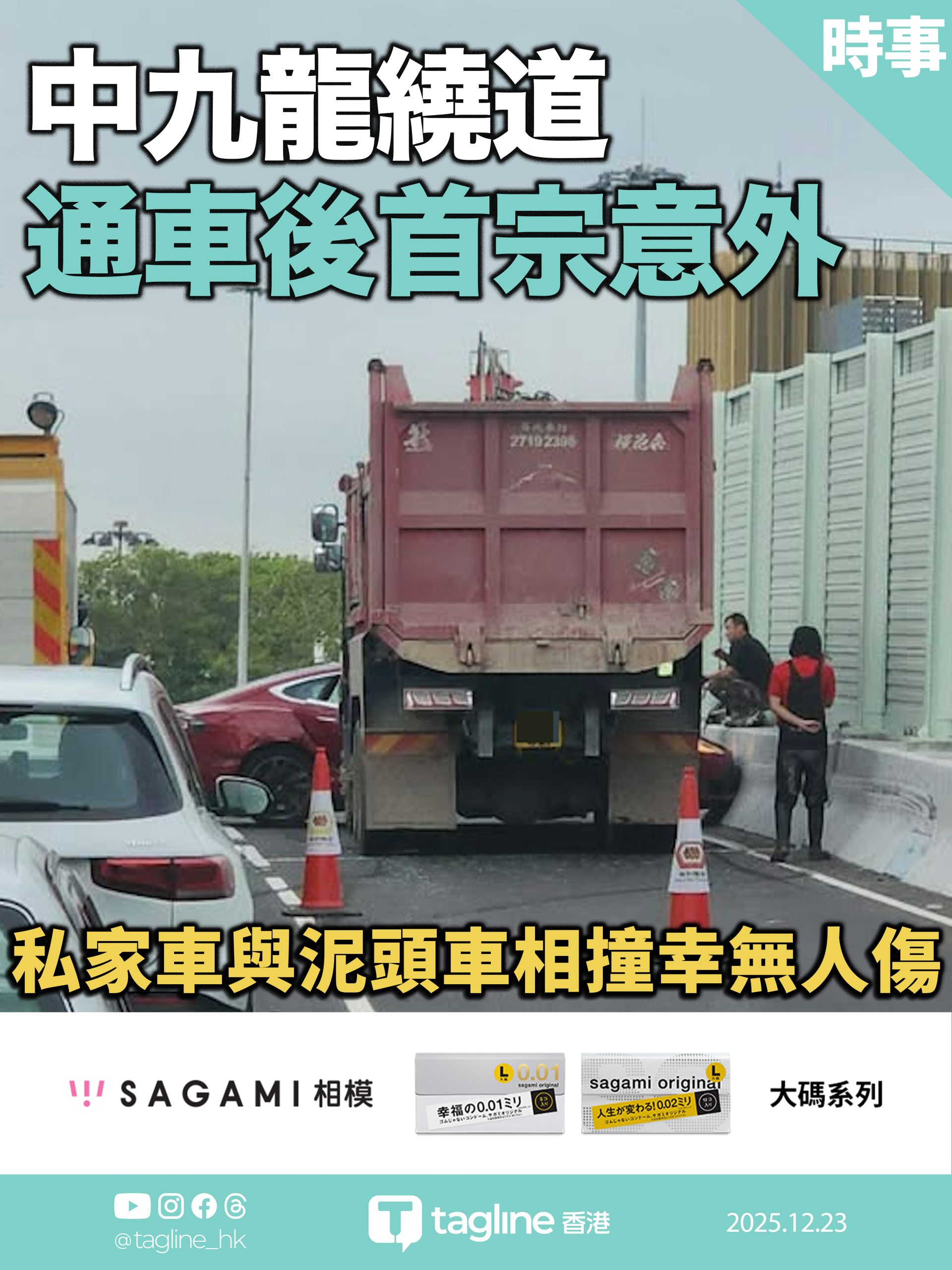 今日(23日)上午繁忙時間,中九龍繞道(油麻地段)發生通車後首宗交通意外,涉及一輛私家車及一輛泥頭車相撞,事故一度導致部分行車線封閉,幸未造成人員傷亡。