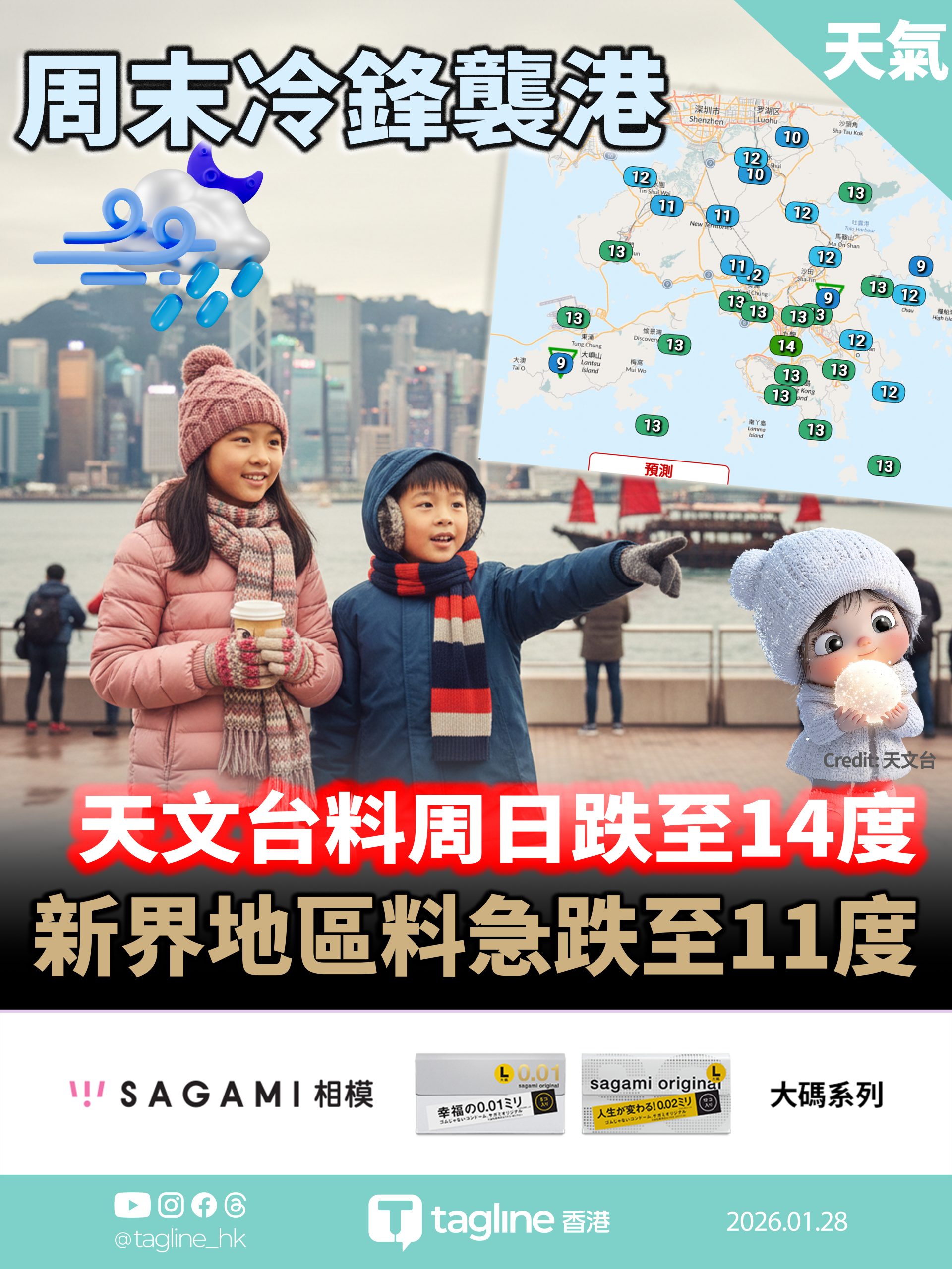 【Sagami安全套特約】周末冷鋒襲港 天文台料周日跌至14度 新界地區料急跌至11度