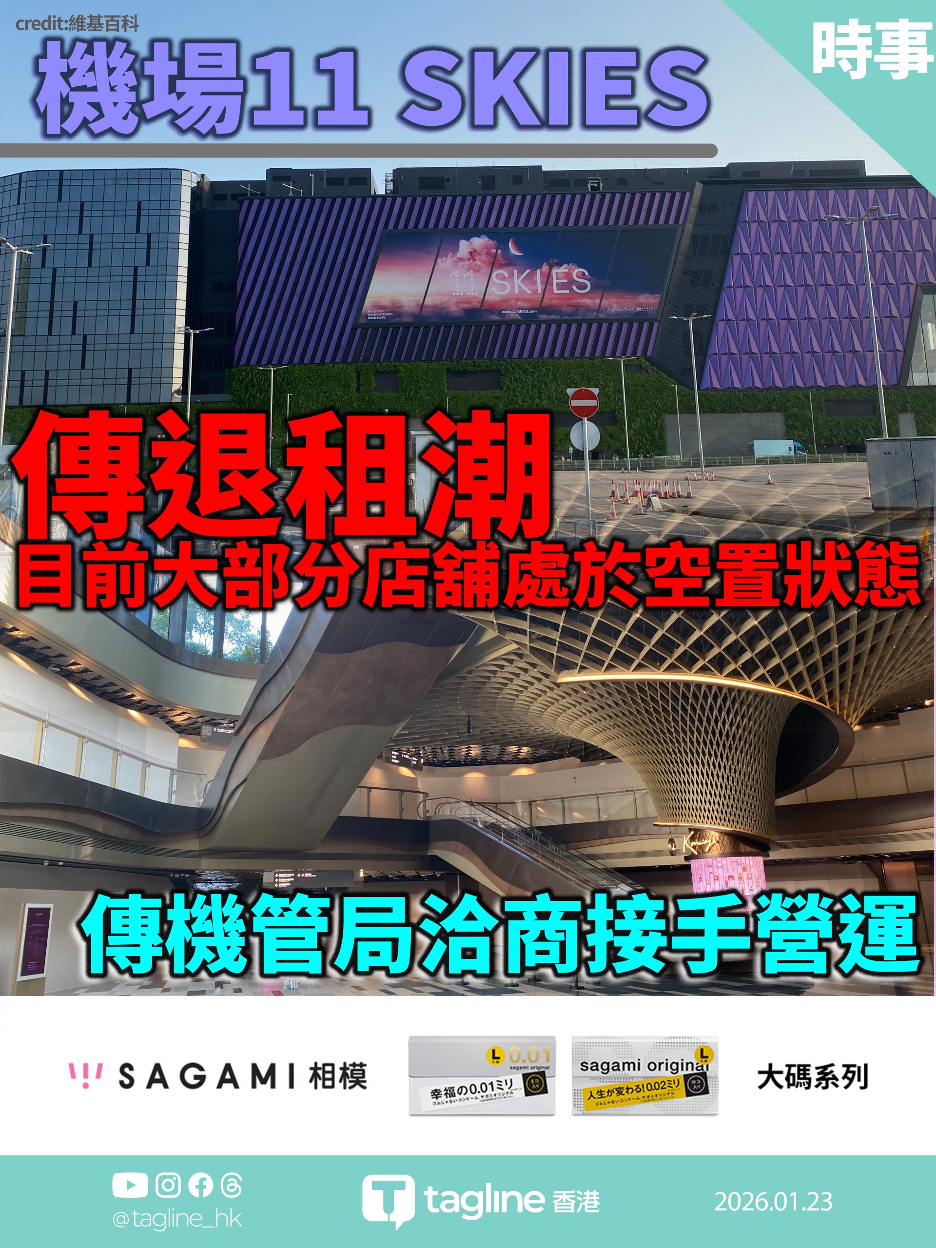 據《彭博》引述消息人士報道,新世界發展(00017)位於香港國際機場的巨型商業項目「11 SKIES」出現退租潮,多家主要租戶已終止租約,導致商場大部分空間空置。消息指,由於空置率上升及租金壓力,新世界正急於出售該資產,而機場管理局正考慮接手營運,並已與其他發展商進行洽商。