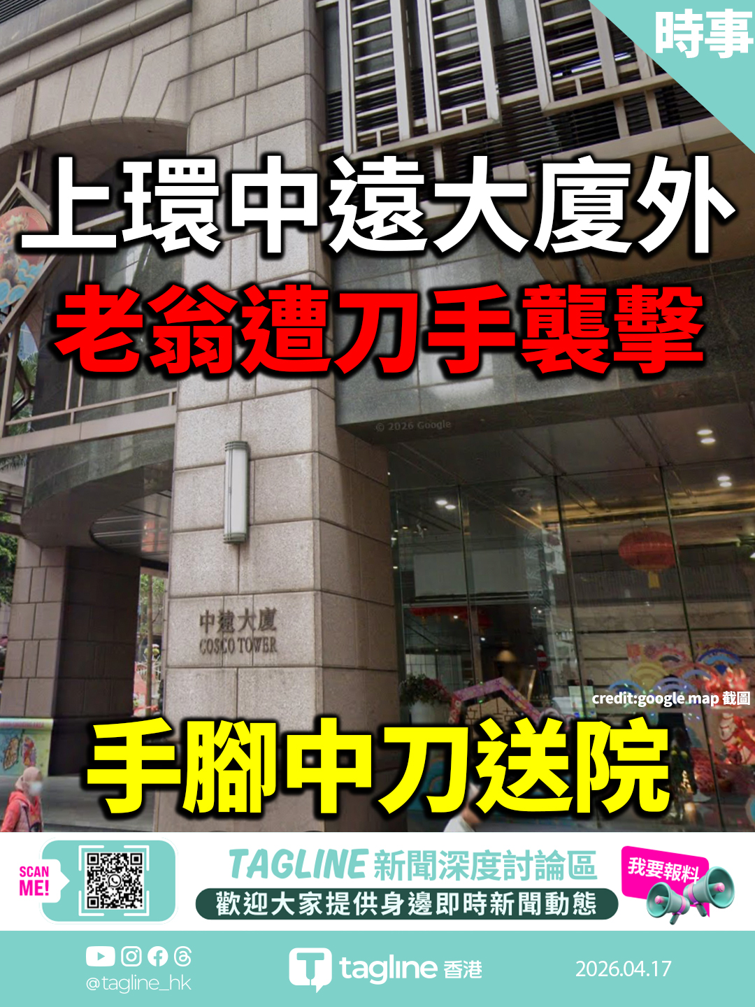 今日上午11時17分,警方接獲報案,指一名老翁在永樂街33號中遠大廈外被一名男子用刀刺傷。救援人員到場為他治理,其後送往瑪麗醫院。大批警員在場調查,正追緝涉案男子。