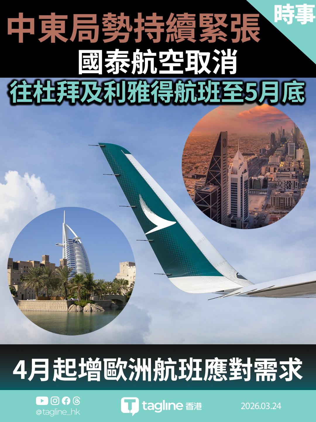 中東局勢持續緊張 國泰航空取消往杜拜利雅得航班至5月底 4月起增歐洲航班應對需求