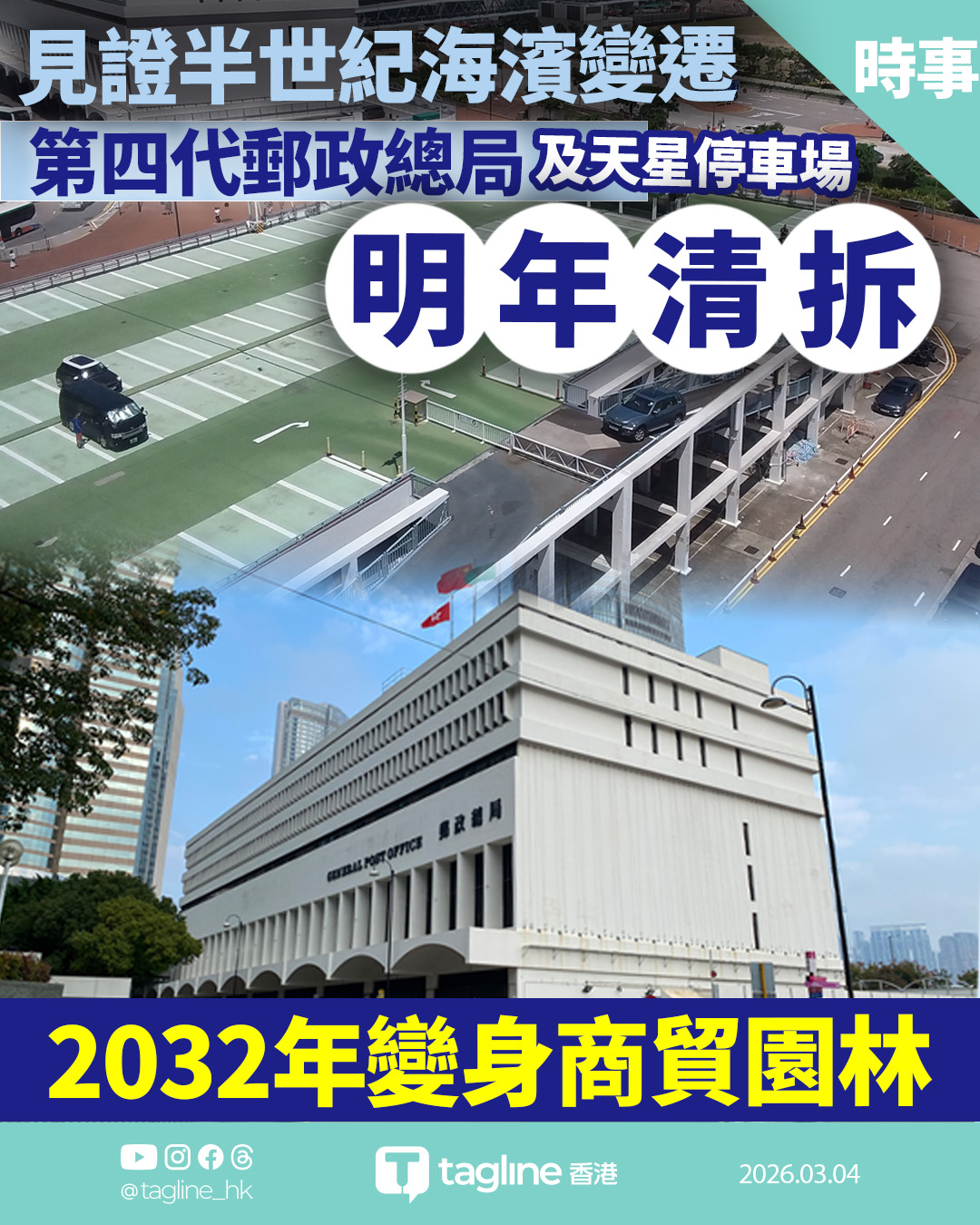 隨着連接國際金融中心與天星碼頭的民耀街行人天橋近日完成拆卸,中環海濱三號用地的地標建築群正式進入倒數階段。位於恒地新商業項目範圍內的郵政總局及天星停車場,預計於明年拆卸。