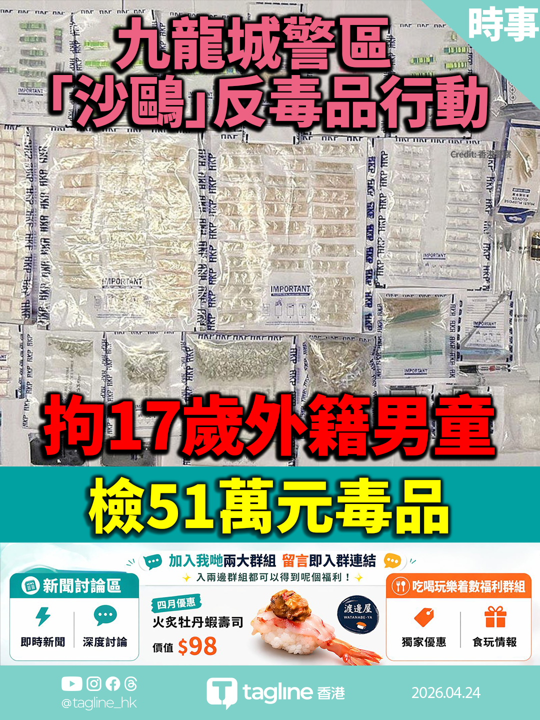 九龍城警區特別職務隊根據線報,昨日(23日)在土瓜灣道一帶展開代號「沙鷗」的反毒品行動,拘捕一名17歲外籍男童,檢獲市值約 51萬元 的懷疑毒品,包括可卡因、冰毒、搖頭丸、迷幻蘑菇、毒郵票及二甲基色胺(死藤水)等。