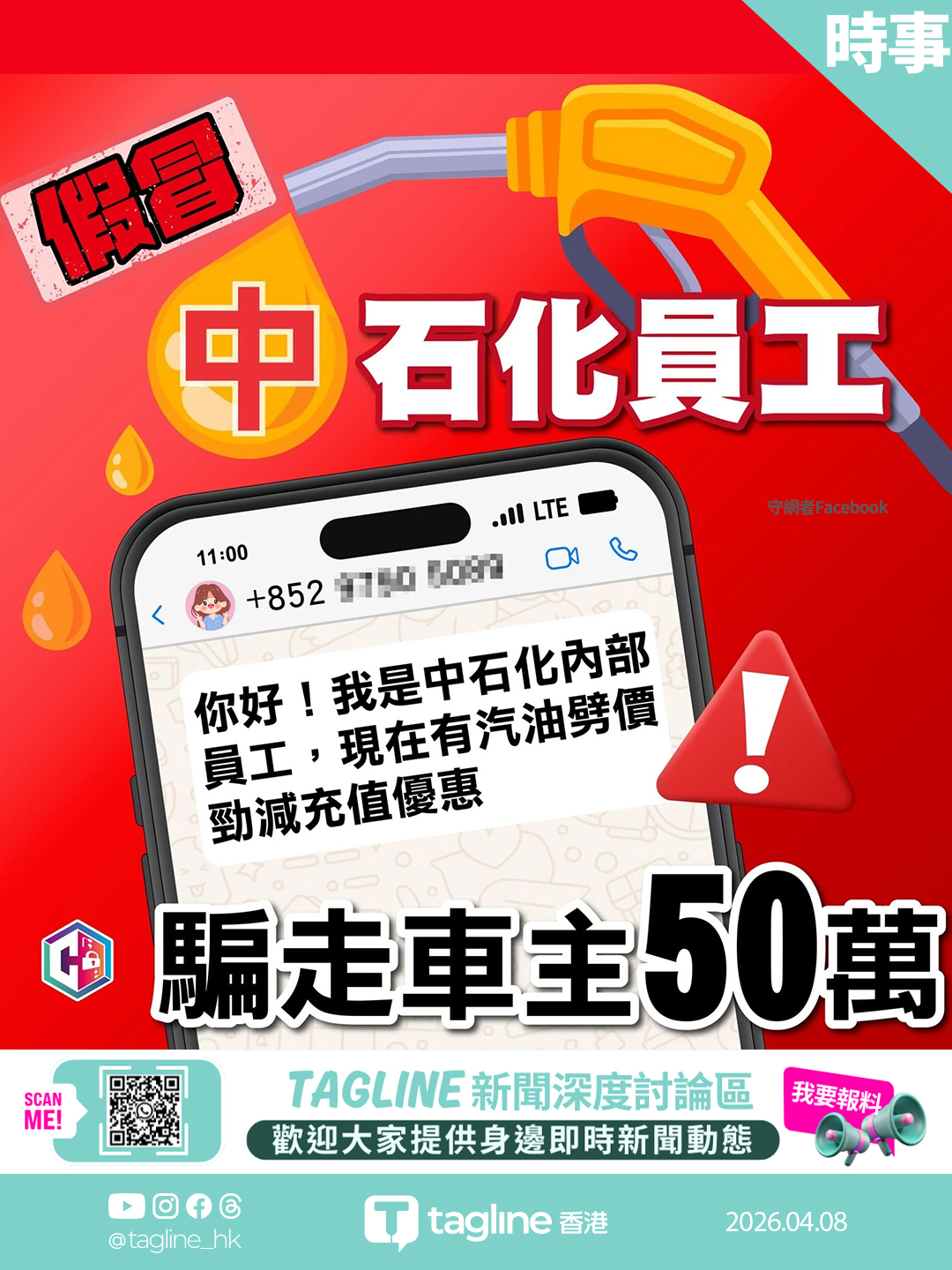 警方透露,受害人收到來自假冒「中國石化內部員工」的WhatsApp訊息,訛稱可提供汽油充值優惠卡,誘騙即時購買。由於受害人過往曾使用其他油公司的優惠卡,未有起疑。騙徒進一步聲稱多買可獲更高折扣,受害人在個半月內先後轉賬超過十次至多個不明個人銀行戶口。其後受害人遲遲未收到實體卡,騙徒再要求繳付「個人所得稅」,受害人才驚覺受騙。