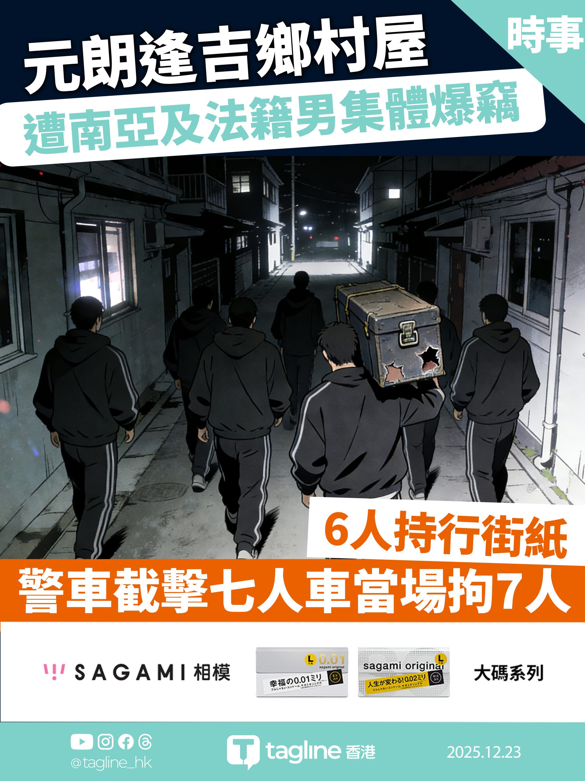 元朗八鄉逢吉鄉路發生一宗「多國聯軍」集體爆竊案。昨日(22日)凌晨約1時21分,一名46歲胡姓女住戶報案,指其位於逢吉鄉路的村屋遭人潛入爆竊。警方接報後迅速趕至現場,當場攔截一輛企圖逃走的黑色七人車,並拘捕車上7名男子。
