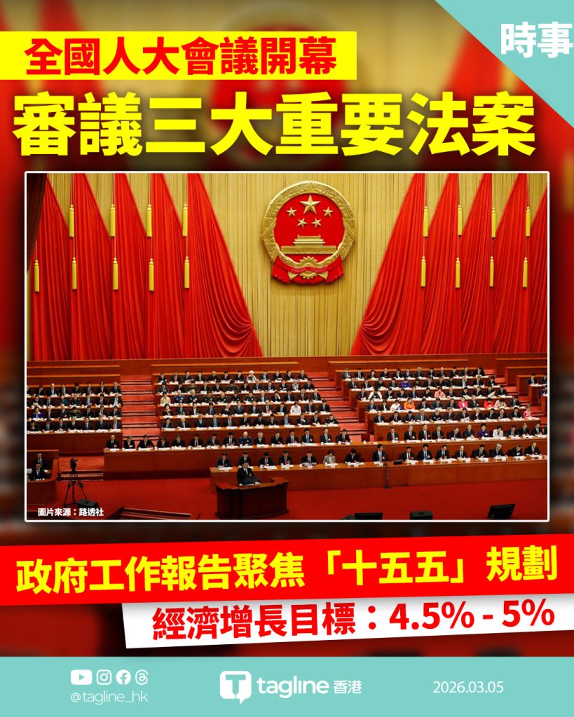 全國人大會議開幕:審議三大重要法案 經濟增長目標保「4.5%至5%」