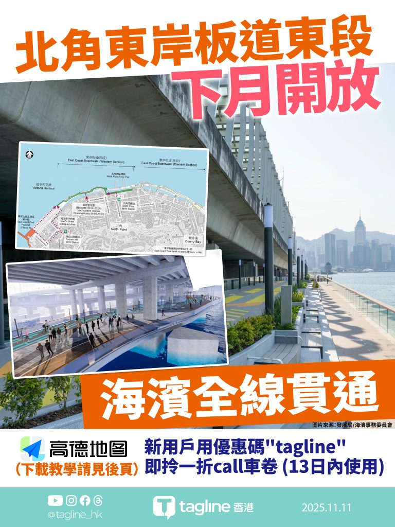 發展局局長甯漢豪在網誌表示,北角東岸板道東段預計下月逐步開放,新路段長約1.1公里,將連接年初開放的西段及北角海濱花園至鰂魚涌海裕街。
