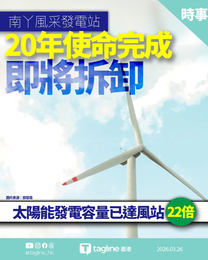 香港地標之一、位於南丫島的「大風車」即將完成歷史使命。港燈昨日(25日)宣布,於2006年啟用的全港首個商業風力發電站——南丫風采發電站,已於今年2月達到20年的設計壽命上限。由於大部份專用零件及後備部件已經停產,加上現場環境限制,市面上並無合適的商用機組作原址替換,為保障公眾安全,港燈決定將設施停運並於稍後安排拆卸。