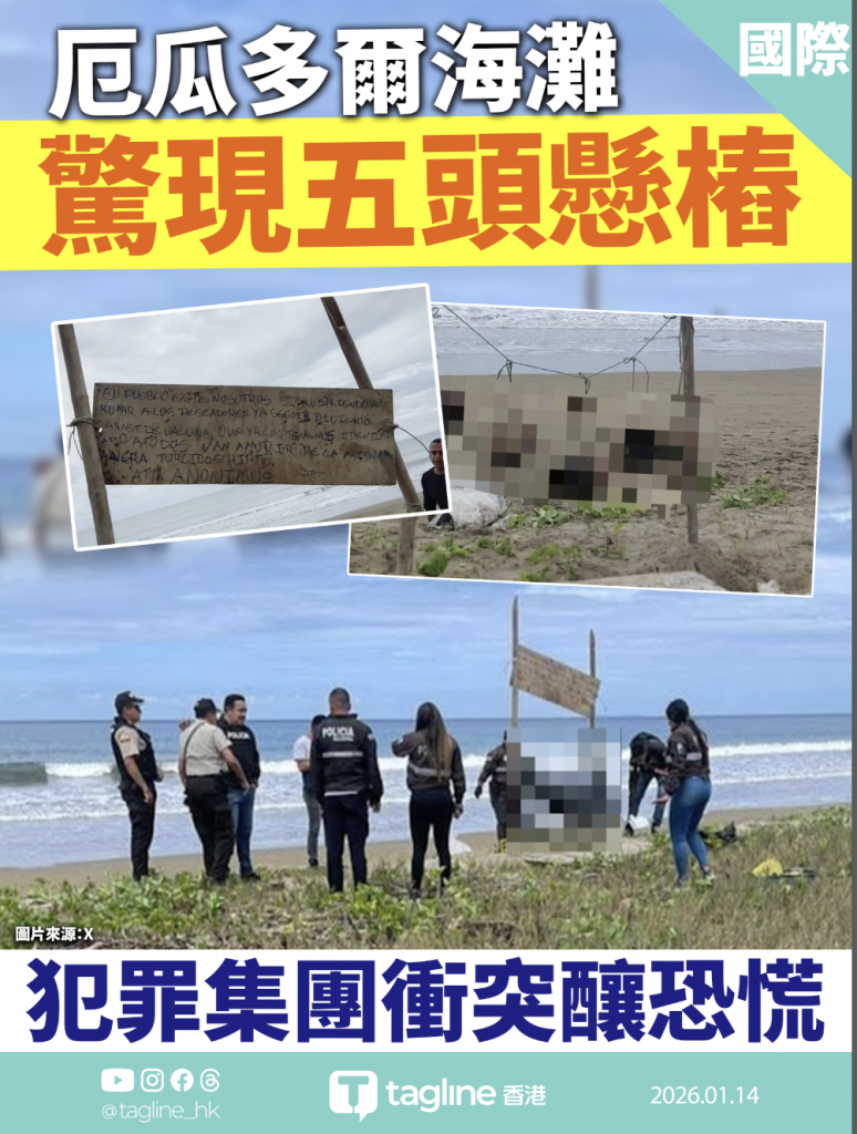南美洲國家厄瓜多爾(Ecuador)爆發極端殘酷的暴力事件。當地警方於 1 月 11 日在馬納比省(Manabí)一處海灘,赫然發現 5 顆人頭被繩索串連,橫空懸掛在木樁上示眾。木樁橫板上更寫有針對性字句,警告劫掠者不得向當地漁民進行搶劫或勒索,場面極其駭人。