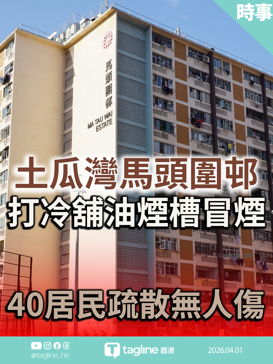土瓜灣馬頭圍邨洋葵樓地下一間打冷舖今早發生火警,油煙槽突然冒煙,約40名居民自行疏散。消防到場將火救熄,事件中無人受傷。