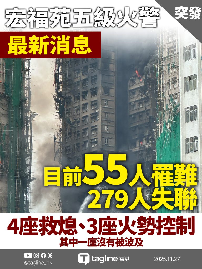 大埔宏福苑昨日(11月26日)發生五級火警,火勢起初從宏昌閣開始蔓延,波及其餘7幢大廈,影響合共2000個單位。消防處總共出動逾800名消防員展開救火與救援工作,部分大廈火勢於今日(11月27日)凌晨時分已受控。火警至今造成最少55人死亡、17人危殆,其中包括一名37歲消防員在救火期間殉職,另有279人失聯。
