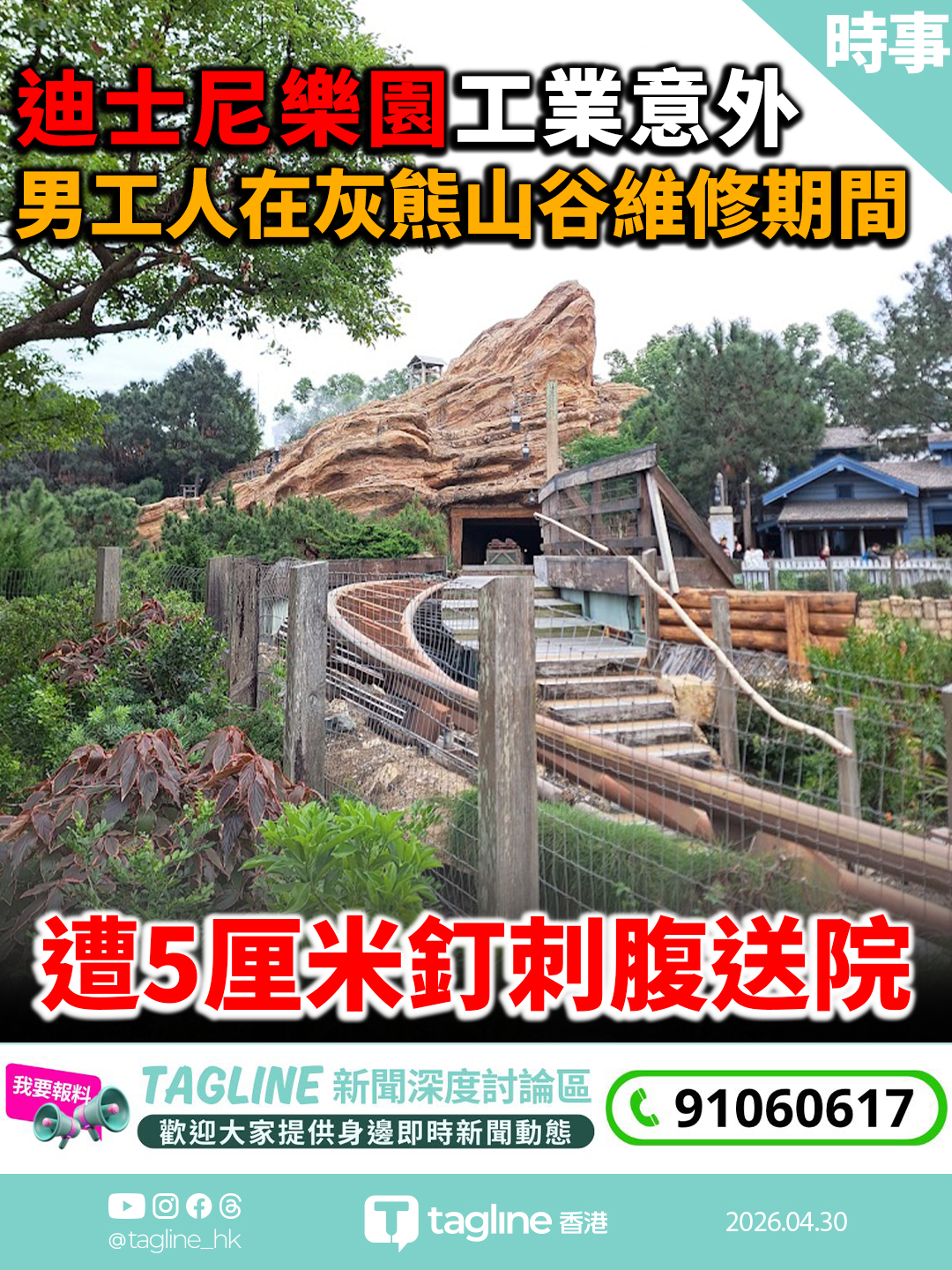 大嶼山香港迪士尼樂園昨日(29日)深夜發生工業意外。一名27歲男工人在灰熊山谷園區進行維修保養工作時,使用釘槍期間懷疑意外被一口長約5厘米的釘刺中腹部,清醒送院治理。警方將案件列作「工業意外」跟進。