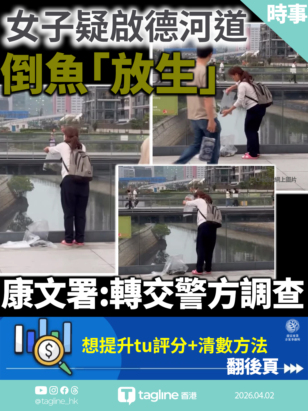 有市民上周四(3月26日)在社交平台Threads上載影片,看到一名女子腳旁放有多個透明膠袋,裝著多條魚,正將牠們倒進啟德河道,多名途人不禁回望。有網民留言稱:「之前有個同事話佢半年會放一次魚,話積福。」亦有網民質疑:「咁高倒落去!好似撻生魚咁,放生有乜意義?」另有網民指出袋中疑似是死魚,「放死!魚都唔識郁掉落明渠,二次污染!」、「死魚放生!即係亂掉垃圾落河。」