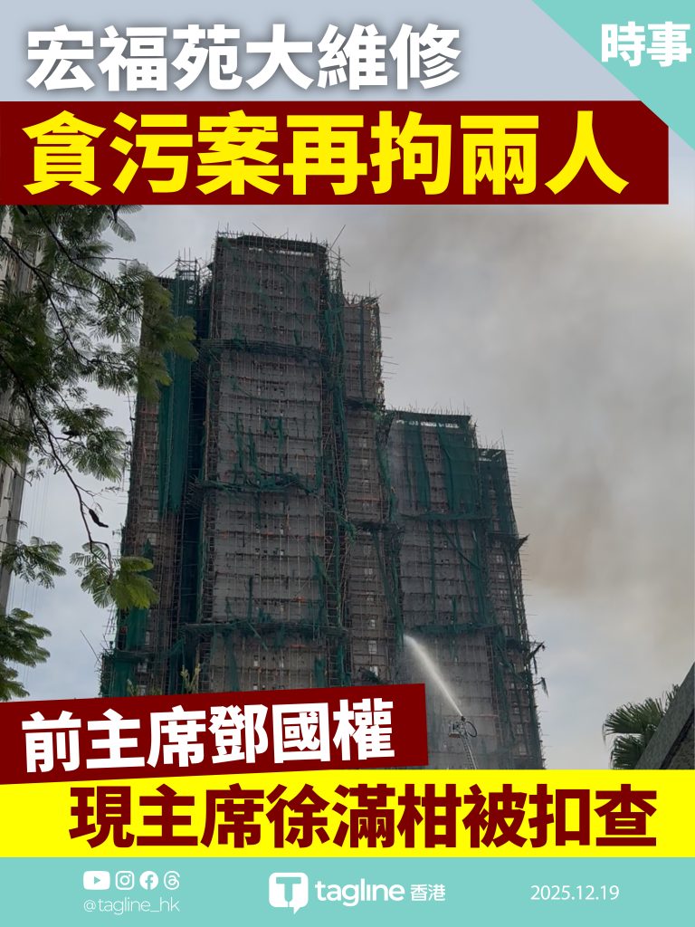 廉政公署調查大埔宏福苑大維修工程涉嫌貪污案有新進展。繼上月下旬展開全面調查後,廉署昨日(18日)再拘捕兩人,分別為宏福苑業主立案法團前主席鄧國權及現任主席徐滿柑。截至目前為止,廉署就此案已累計拘捕 14 人。