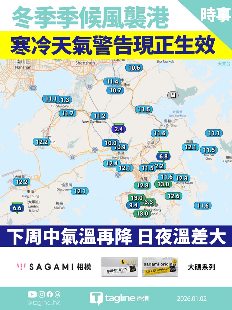 香港天文台發出寒冷天氣警告,今日早上錄得12.9度的入冬最低氣溫紀錄。