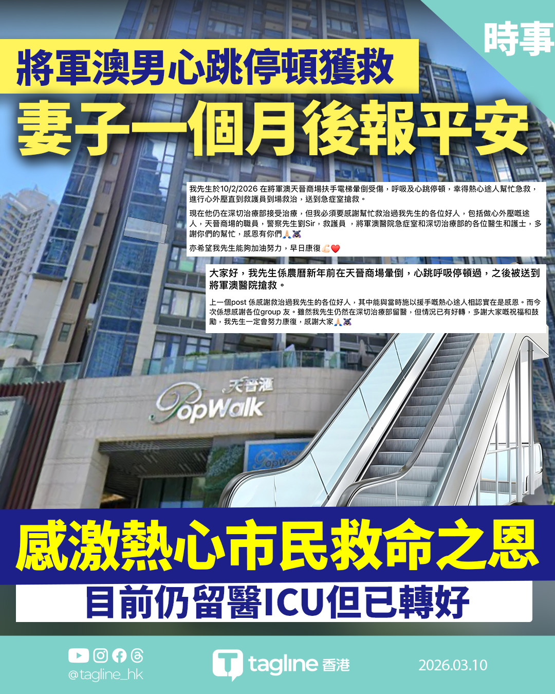 事隔一個月,事主妻子於3月9日在社交平台發文,向所有曾施以援手的人士致謝。她表示,丈夫目前雖然仍在深切治療部(ICU)留醫,但情況已有所好轉,並感激網民的鼓勵與祝福,強調丈夫會努力康復。妻子早前亦曾發文,點名感謝當日參與營救的途人、商場職員、救護員及醫護人員,形容能在網絡上與救命恩人相認,實在心存感恩。