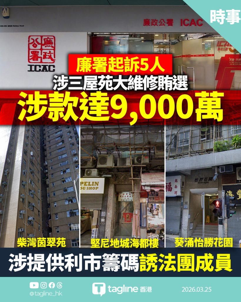 廉政公署今日(25日)分三宗案件落案起訴五名男女,年齡介乎42歲至70歲,指他們涉嫌就三個屋苑的大維修工程行賄法團成員及業主代表。三項工程總值約9,000萬元,五名被告今日在東區裁判法院提訊。