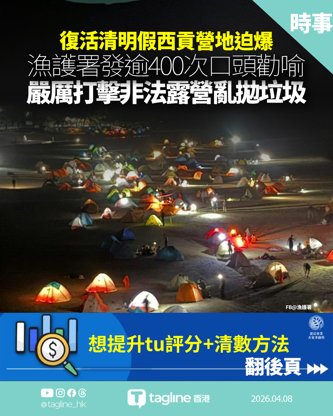 署方於4月3日至6日在西貢東一帶採取執法行動,共錄得18宗涉及亂拋垃圾及非法露營的個案,並發出418次口頭勸喻。數據顯示,鹹田灣及西灣營地高鋒期每晚合共近250個營帳。