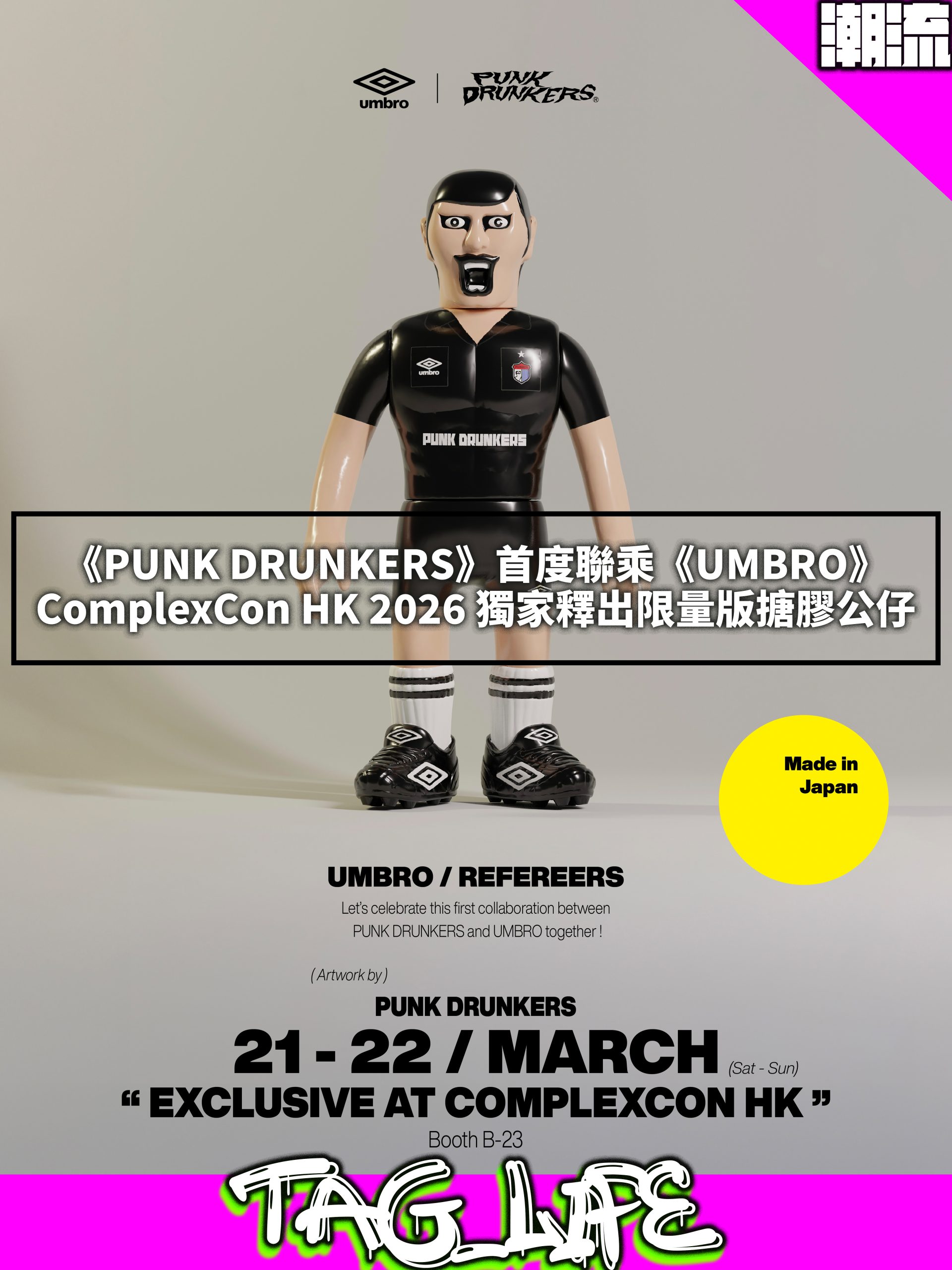 @tag_life.hk :全球潮流文化焦點 ComplexCon Hong Kong 即將於亞洲國際博覽館舉行。作為定義當代街頭藝術與流行趨勢的重要指標,歷來是各大品牌展現創意的絕佳舞台。而今年剛好是世界杯年,香港創意選物單位 General Purpose/ 特意邀請日本怪誕街頭品牌 PUNK DRUNKERS 夥拍英國經典足球品牌 UMBRO 獨家推出球證造型 ComplexCon 限量版搪膠公仔。過去一段時間,General Purpose/ 頻頻展開矚目合作,為街頭圈製造不少話題;而極具代表性的 PUNK DRUNKERS,其經典角色 Aitsu(我)的每一次現身總能引起粉絲與收藏家的熱烈討論,加上充滿足球基因的 UMBRO,此番三方聯手,勢必成為本屆 ComplexCon 的其中一項矚目焦點。