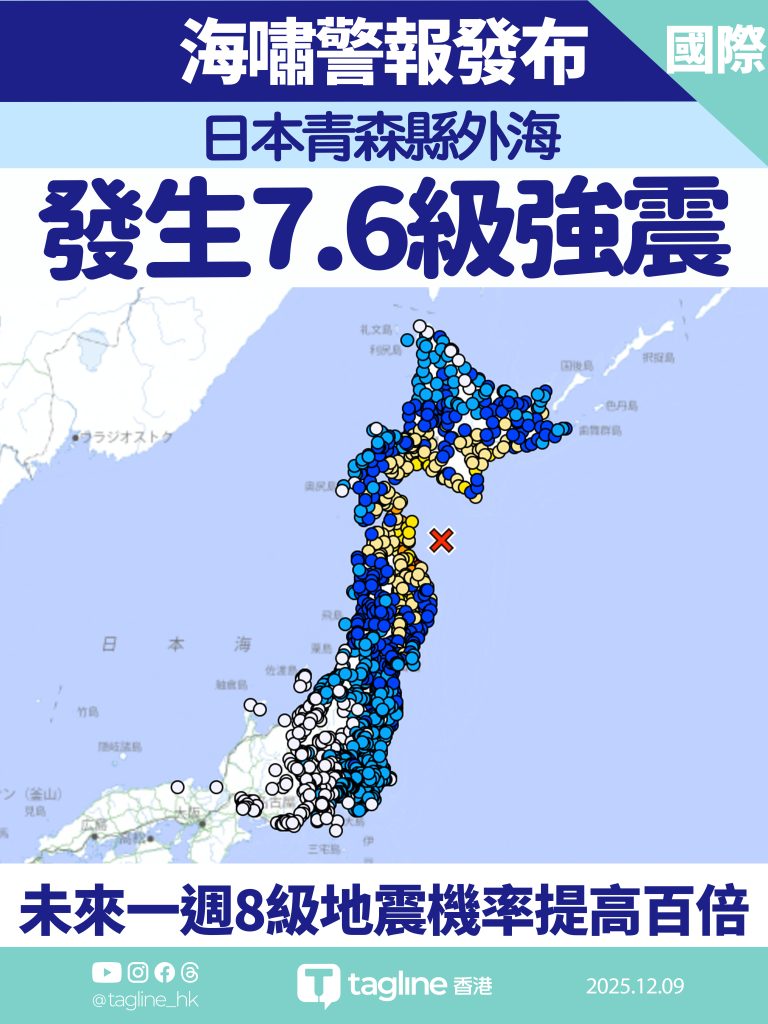 日本青森縣外海於當地時間12月8日(週一)晚間發生芮氏規模7.5級(氣象廳最終修正為7.6級)強烈地震,震源深度約50公里。地震發生後,當局立即對北海道與東北沿岸發布海嘯警報,預計浪高恐達3米。