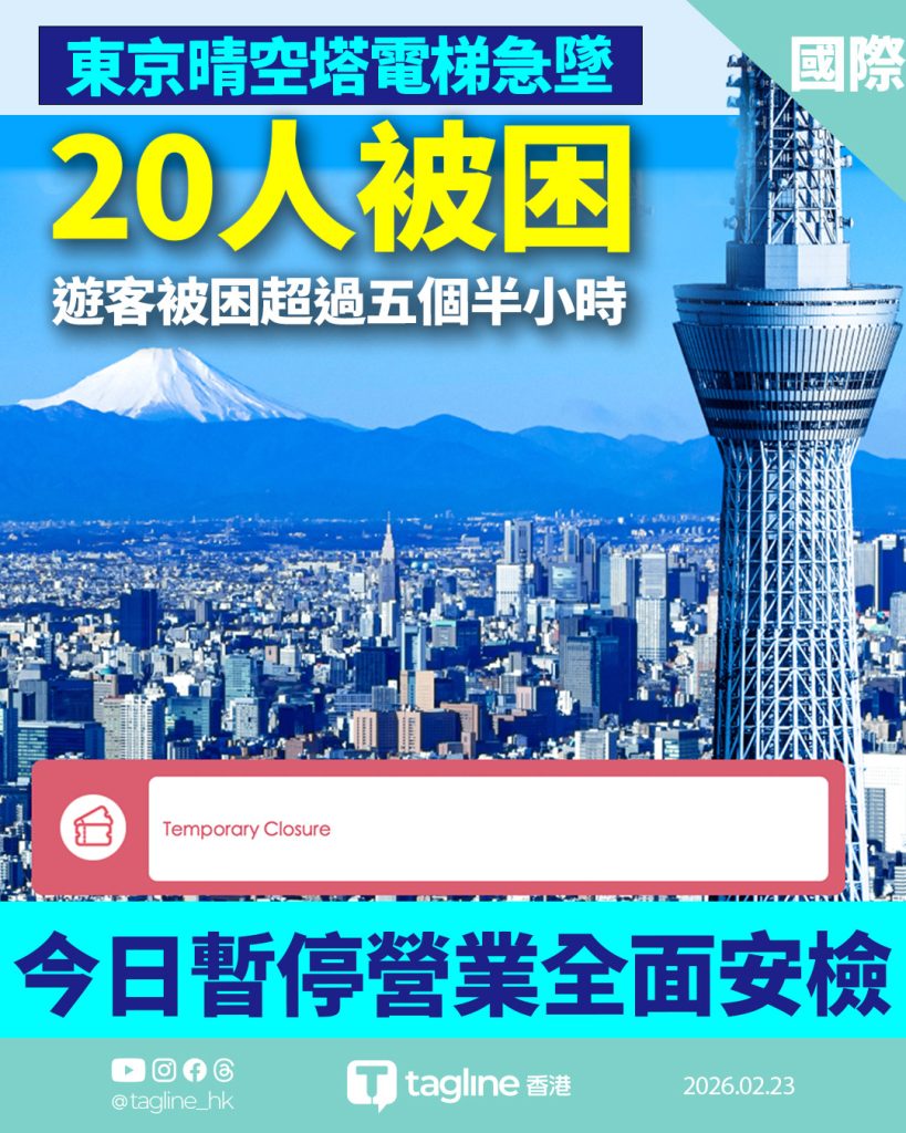 東京晴空塔昨晚發生罕見電梯事故,約20名遊客被困升降機內超過五個半小時,至今日凌晨始獲救,無人受傷。營運商就事件致歉,並宣布晴空塔今日(23日)暫停營業,以全面檢查所有升降機設施。