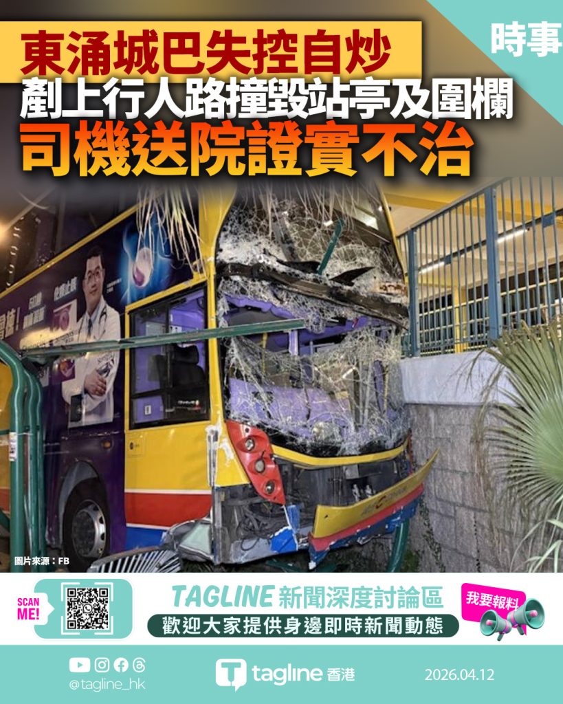 昨日(11日)晚近11時,東涌發生致命交通意外。一輛城巴沿松仁路慢線行駛期間,懷疑突然失控,猛烈衝上行人路並撞毀巴士站涼亭,再掃毀數米長圍欄,最終停在天橋底。