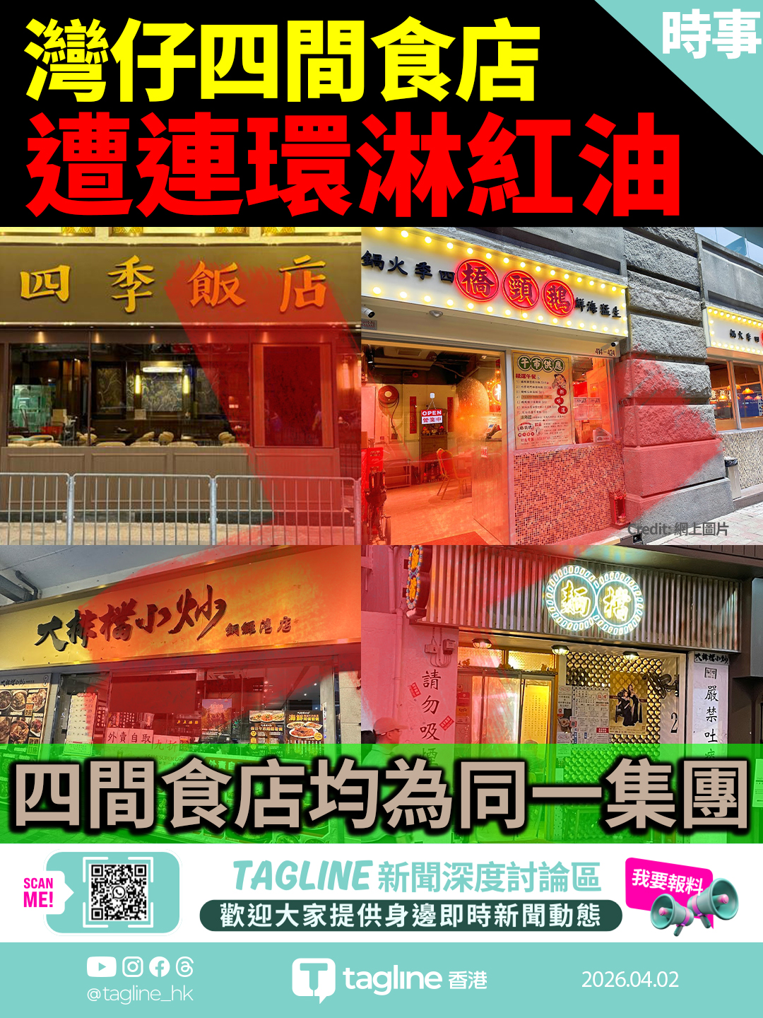灣仔區同一集團經營的四間食店,今早分別遭人淋潑紅油破壞,包括車仔麵店、火鍋店及兩間中式菜館。警方將案件列作「刑事毀壞」調查,正追查犯案動機及涉案人士。