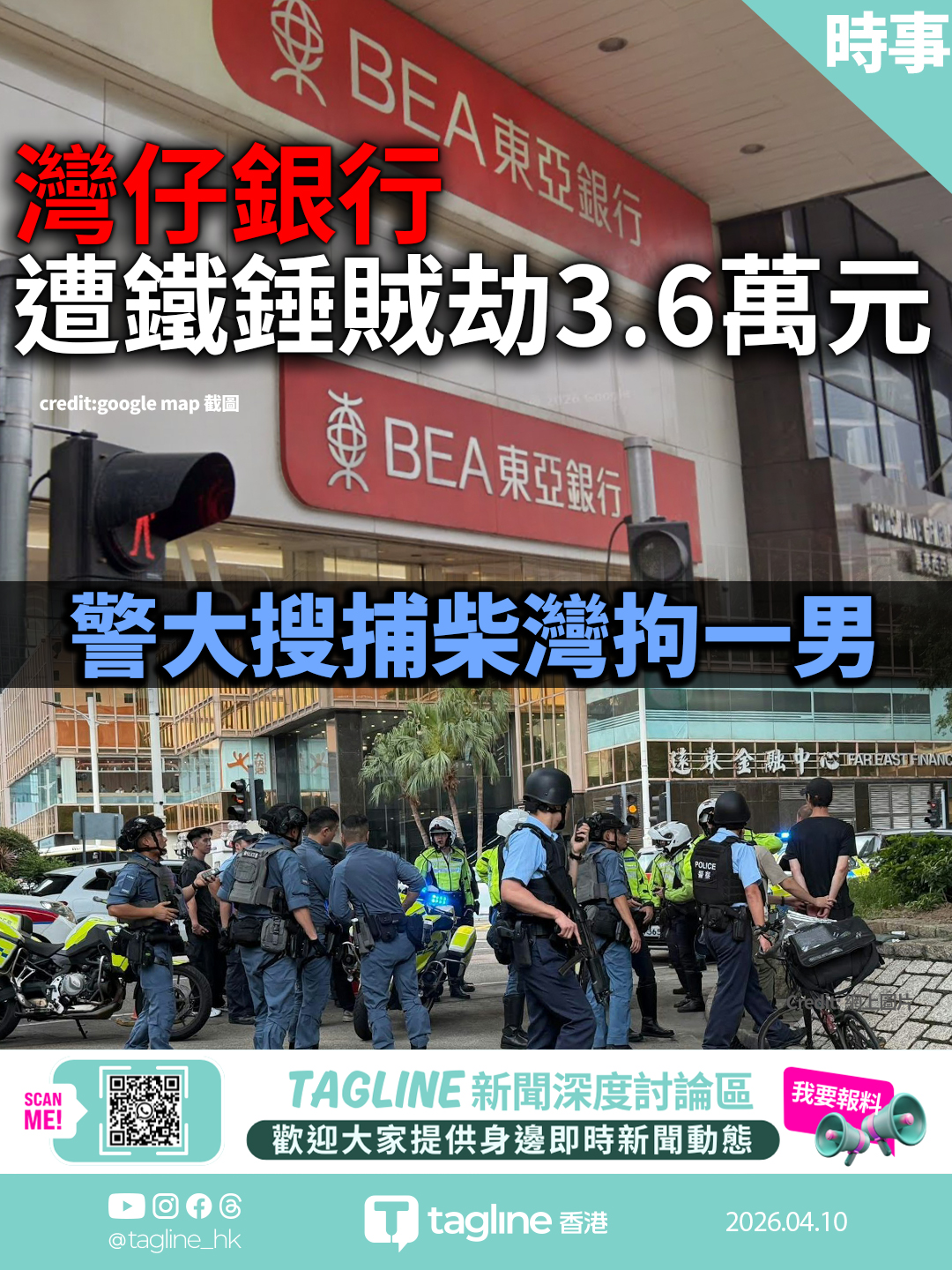 灣仔銀行遭鐵錘賊劫3.6萬元 警大搜捕柴灣拘一男