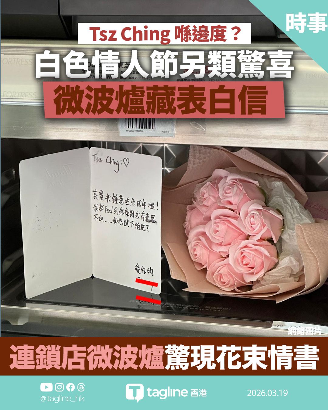 白色情人節另類驚喜 連鎖店微波爐內發現表白信與花束 全城尋「Tsz Ching」