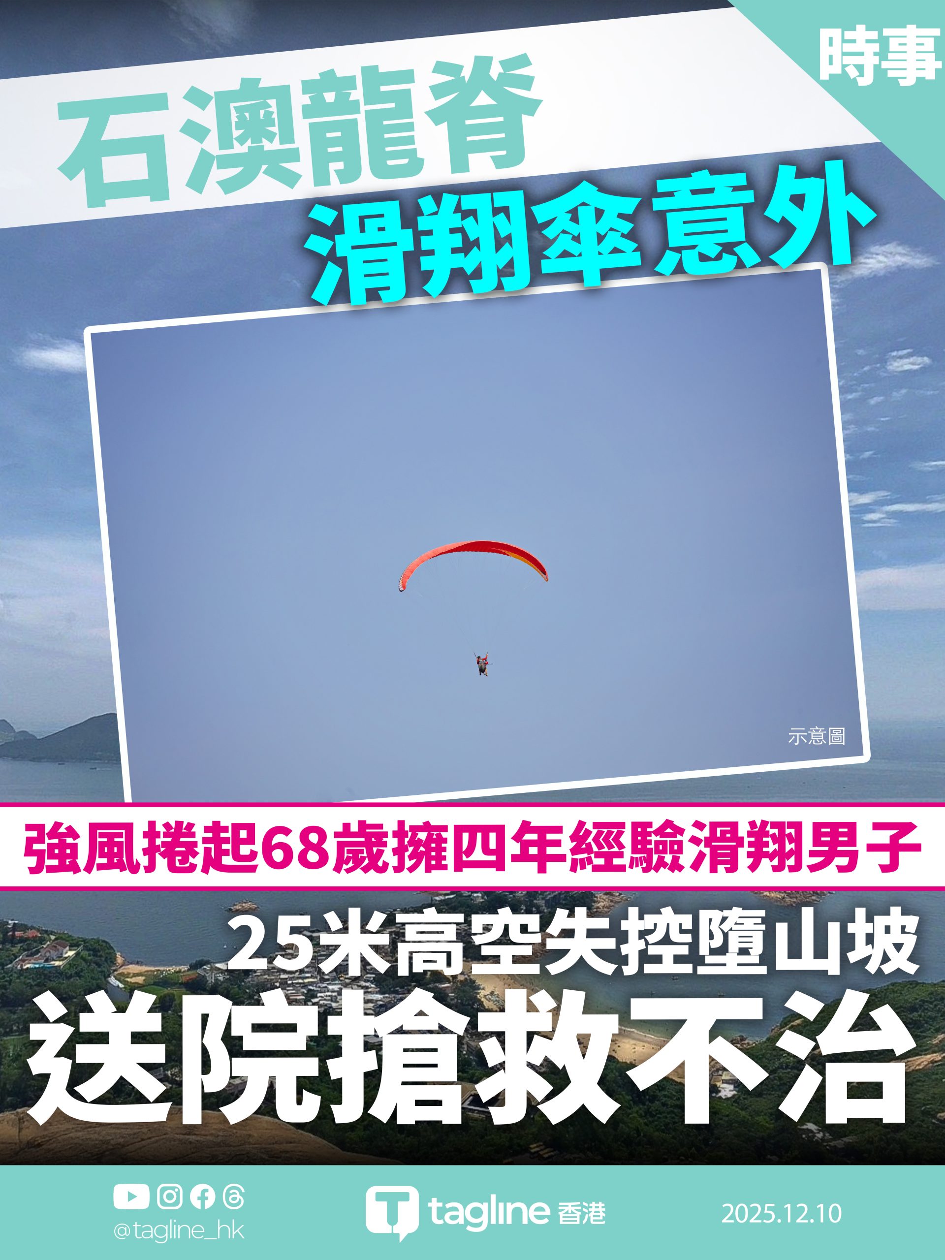 一名68歲男子於今日下午2時許在石澳龍脊進行滑翔傘活動時發生意外,遭強風捲起後失控墮山,送院搶救後不治身亡。