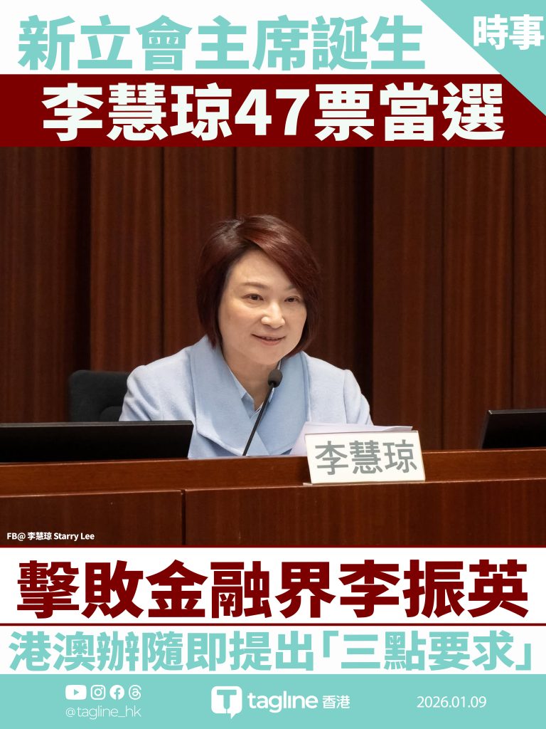 立法會昨日(週四)舉行新一屆主席選舉,全國人大常委李慧琼在投票中,以47票對42票擊敗金融界議員李振英,成功當選新任立法會主席。