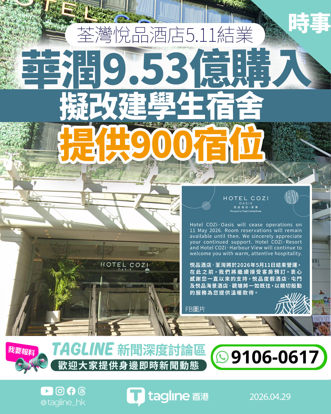 位於葵涌青山公路的悅品酒店・荃灣(Hotel COZI ‧ Castle)今日於社交平台宣布,將於今年5月11日正式結束營運。酒店前身為工廈「紅A中心」,由「舖王」鄧成波家族於2012年以5.28億元購入並改裝,至2018年開幕,提供583間客房及多元化設施。