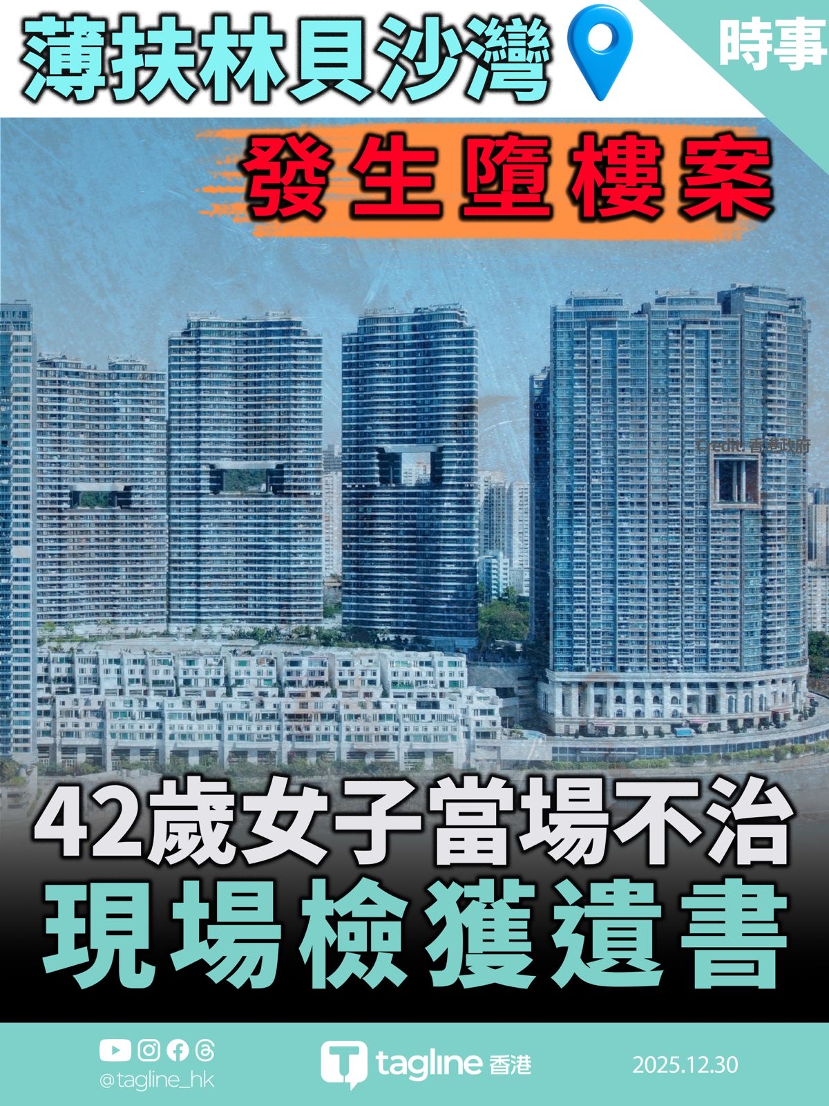 薄扶林貝沙灣今日凌晨發生一宗墮樓案,一名女子被發現倒臥平台,當場證實死亡。警方於現場檢獲遺書,案件暫列作自殺案處理。