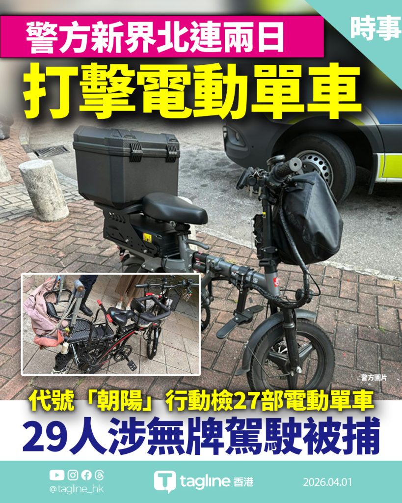 警方新界北總區於剛過去的周日及周一(3月30及31日),在區內展開代號「朝陽」(GOLDENSUN)的執法行動,嚴厲打擊非法駕駛電動可移動工具。行動中共有29人被捕,警方同時扣查29部電動工具作進一步檢驗。