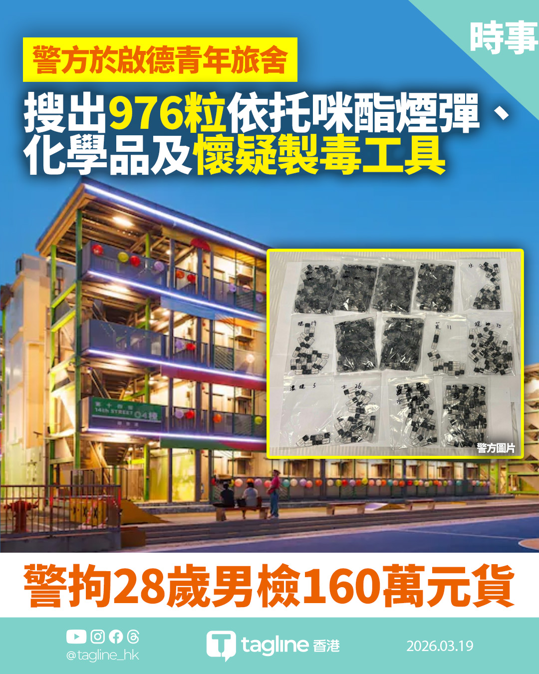 警方日前在啟德採取打擊毒品行動,成功搗破一個藏身於青年旅舍內的製毒工場,檢獲市值約 160 萬元的懷疑毒品,並拘捕一名 28 歲本地男子。