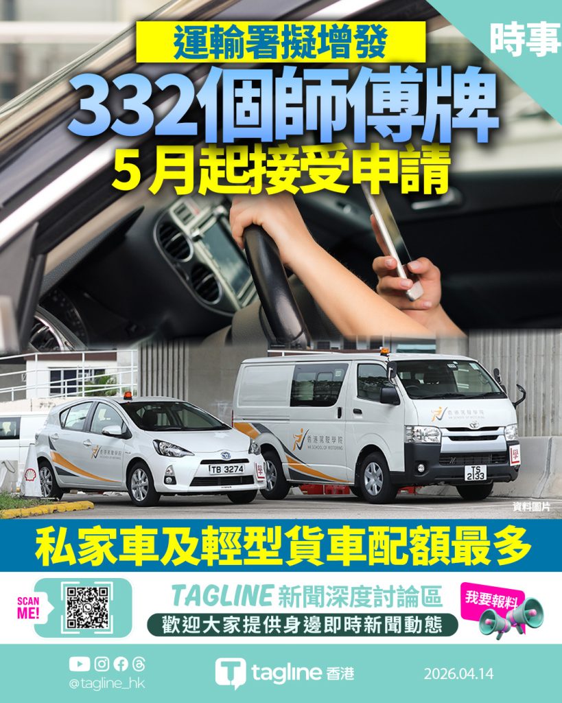 運輸署宣佈計劃增發共 332 個私人駕駛教師執照(俗稱「師傅牌」),以滿足市場需求。是次增發包括 248 個公眾配額及 84 個駕駛教師配額,預計於今年 5 月接受申請,最快 7 月展開筆試及路試。