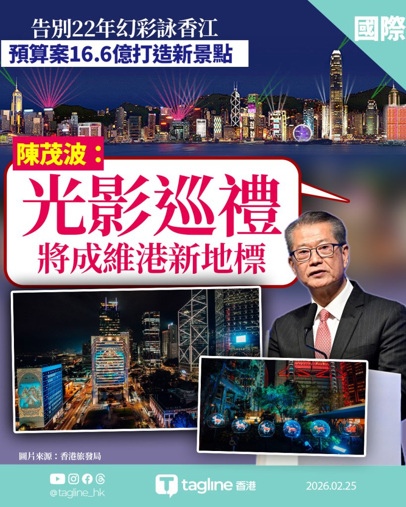 【財政預算案2026】財政司司長陳茂波今日(25日)公布新一份《財政預算案》,宣布向旅發局撥款16.6億元加強旅遊推廣,當中包括推出全新「光影巡禮」表演,取代已舉辦22年的「幻彩詠香江」。陳茂波表示,此舉是為配合旅遊市場新趨勢,有信心新表演能吸引更多旅客來港。