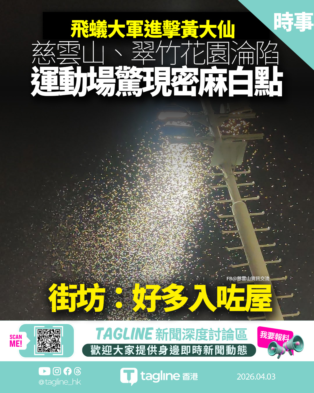 踏入4月,香港天氣不穩且驟雨連連,黃大仙區近日驚現大規模飛蟻入侵。多名街坊在社交平台群組發文警告,指慈雲山中心運動場、翠竹花園及獅子山一帶均有成群飛蟻出沒,更有照片顯示運動場燈柱位聚集了成千上萬的飛蟻,場面令網民直呼「密集恐懼症發作」、「白蟻多到好恐怖」。