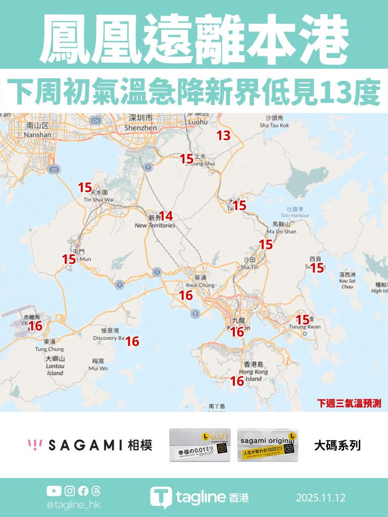 根據自動分區天氣預報,下周二新界地區氣溫將進一步下降,北區打鼓嶺最低僅14度,下周三(19日)更可能降至13度,接近寒冷水平。天文台提醒市民,下周初天氣轉涼,需注意保暖。