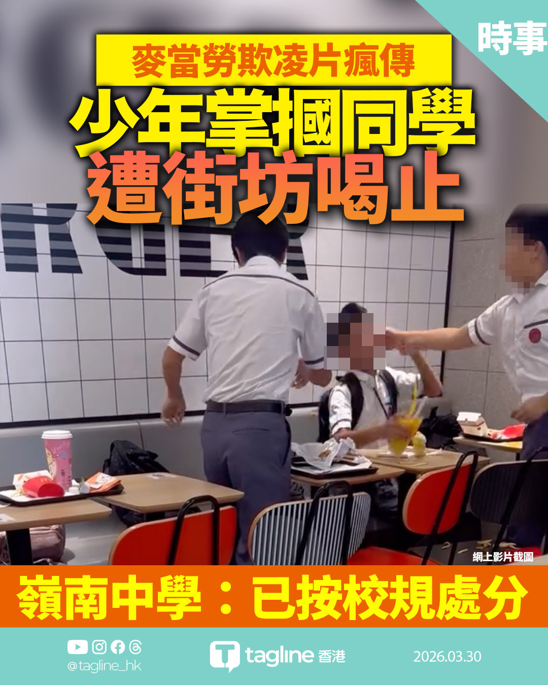 近日社交平台 Threads 流傳一段影片,顯示三名穿著校服的男學生在東區一間麥當勞內發生爭執。片中兩名男學生涉嫌集體欺凌一名戴眼鏡的同學,期間有人淋潑液體並用力掌摑對方。戴眼鏡學生隨即擲杯反擊,涉事男學生欲再動手時,一名在場大叔即時出手制止並喝斥。涉事男學生當時回身辯稱「佢打我喎」,影片引發網民熱議,不少人斥責欺凌行為離譜,並大讚大叔見義勇為。