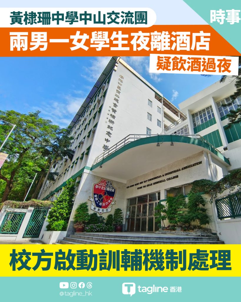 深水埗香港四邑商工總會黃棣珊紀念中學日前舉辦中五級內地考察團,期間發生嚴重違紀事件。據了解,該校三名學生於中山交流期間,涉嫌於夜間擅自離開入住酒店外出飲酒,甚至翌日清晨才返回。教育局對此表示高度關注,已要求校方呈交正式報告。